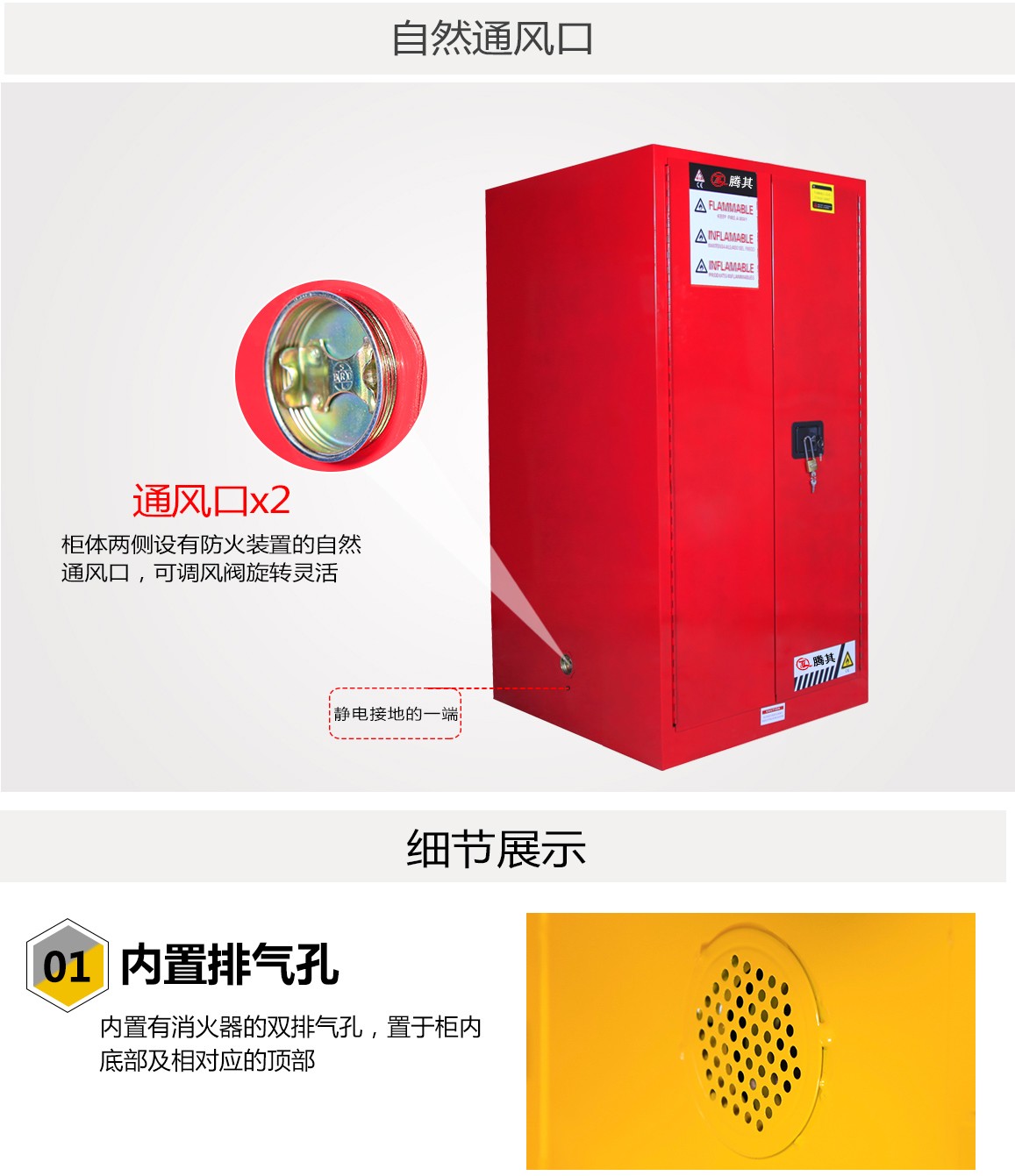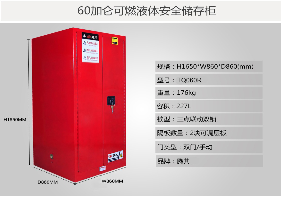 高性能的TQ腾其安全柜达到OSHA 29 CFR1910.106标准(美国职业安全健康管理局),符合NFPA CODE30(美国国家消防协会)第30条规定的要求用于规范存储易燃易爆液体及危险化学品。