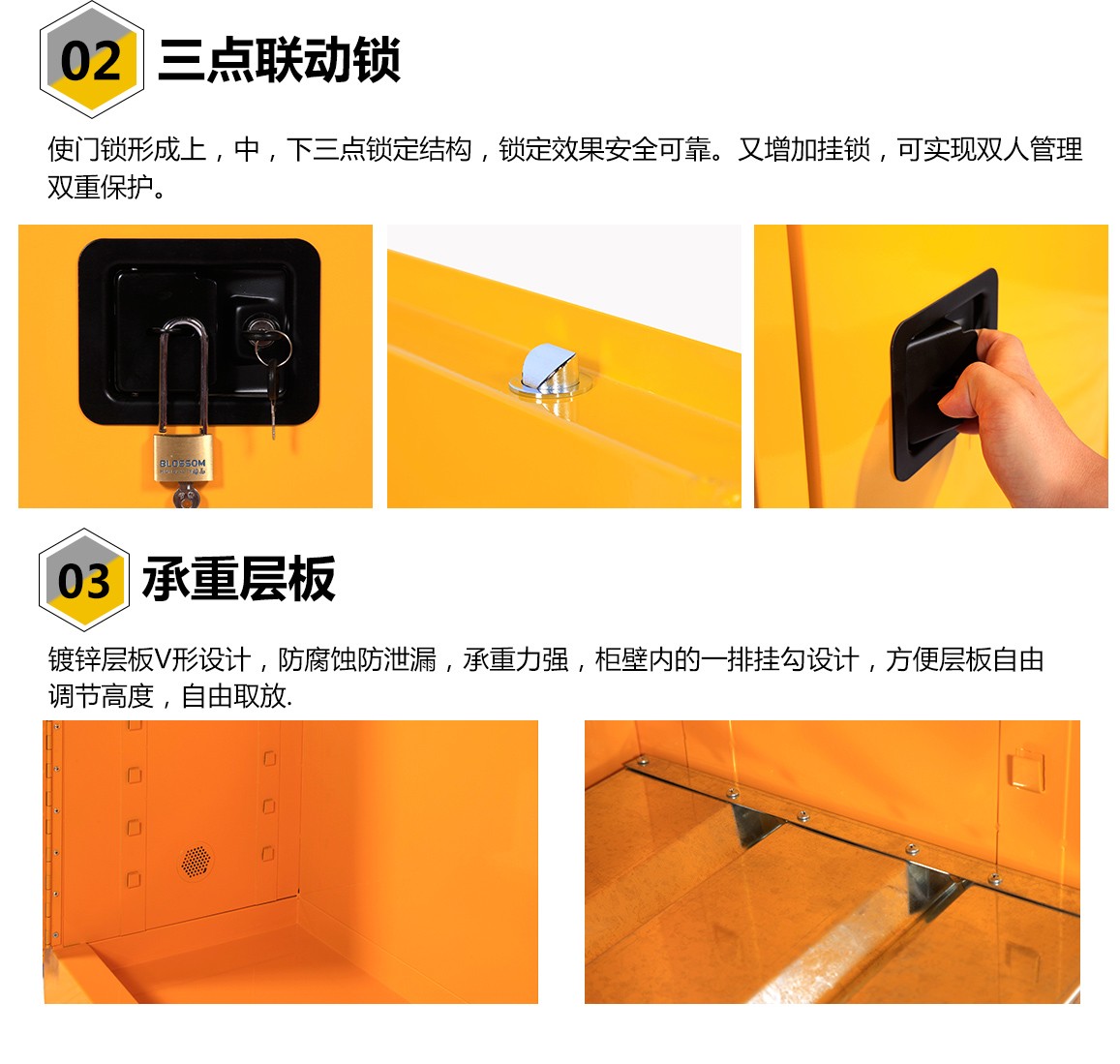 8:独有的镀锌层板,防腐蚀,防液漏,层板具有150公斤承重力。独特的安全角度设计,层板可安全的引导意外飞溅的液体到防漏蓄液槽的底部。蓄液槽高度为50mm符合EPA要求。