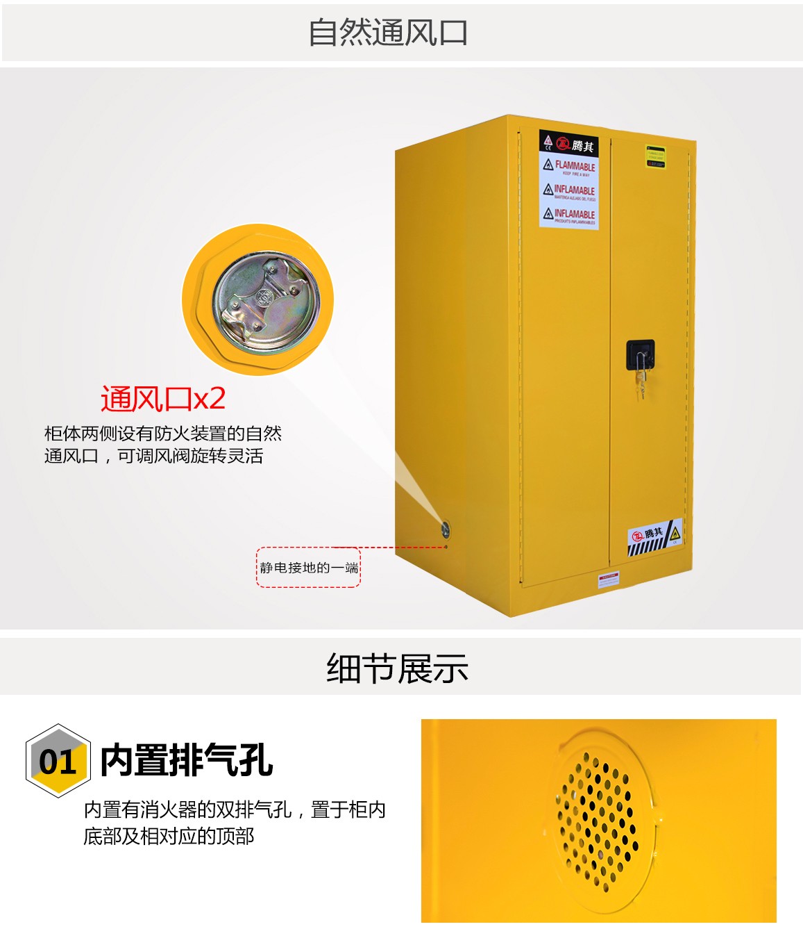 高性能的TQ腾其安全柜达到OSHA 29 CFR1910.106标准(美国职业安全健康管理局),符合NFPA CODE30(美国国家消防协会)第30条规定的要求用于规范存储易燃易爆液体及危险化学品。