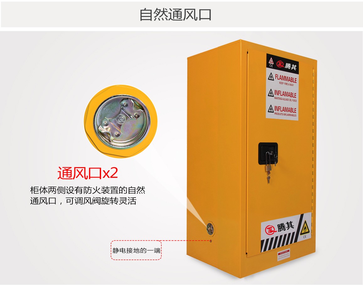 高性能的TQ腾其安全柜达到OSHA 29 CFR1910.106标准(美国职业安全健康管理局),符合NFPA CODE30(美国国家消防协会)第30条规定的要求用于规范存储易燃易爆液体及危险化学品。
