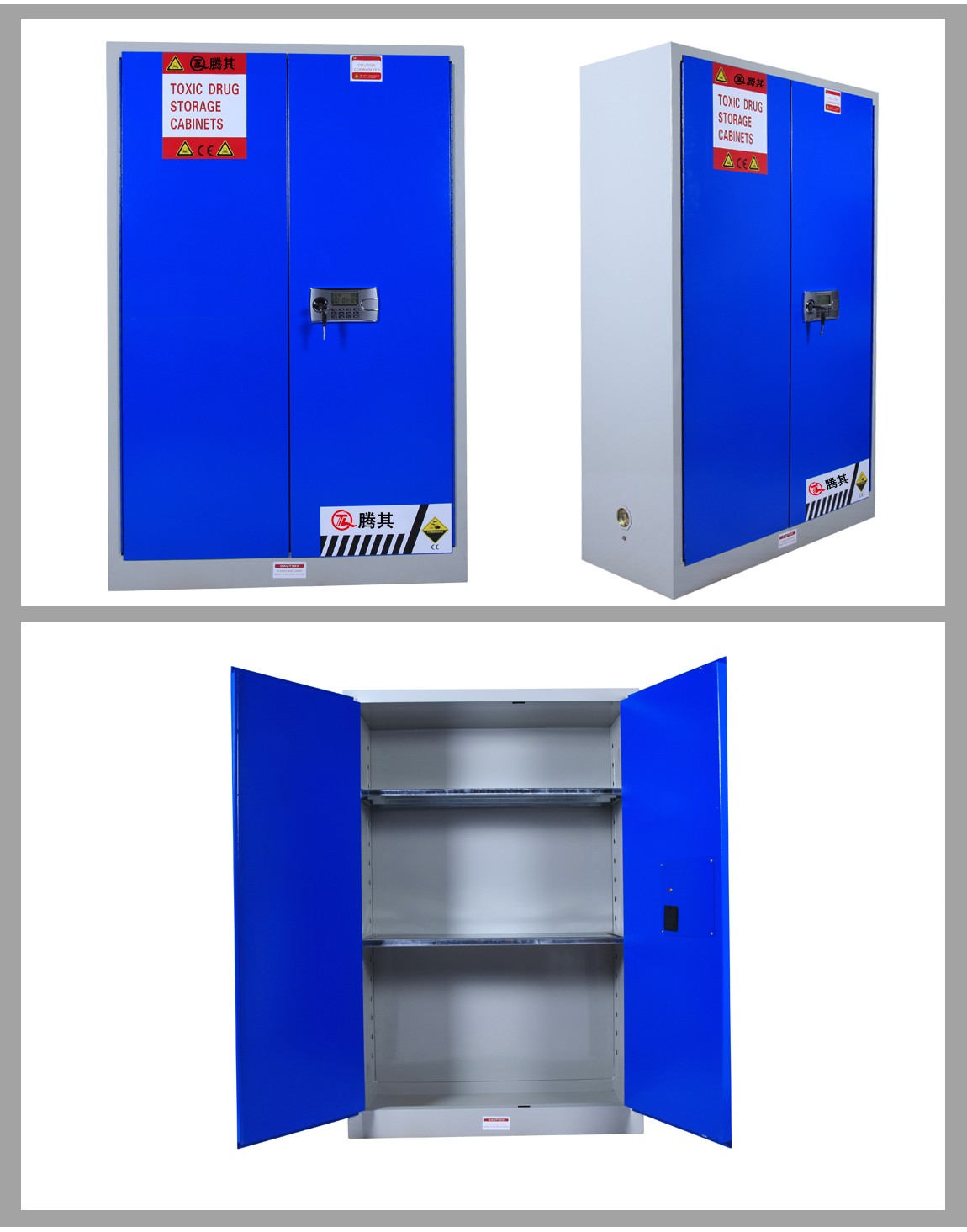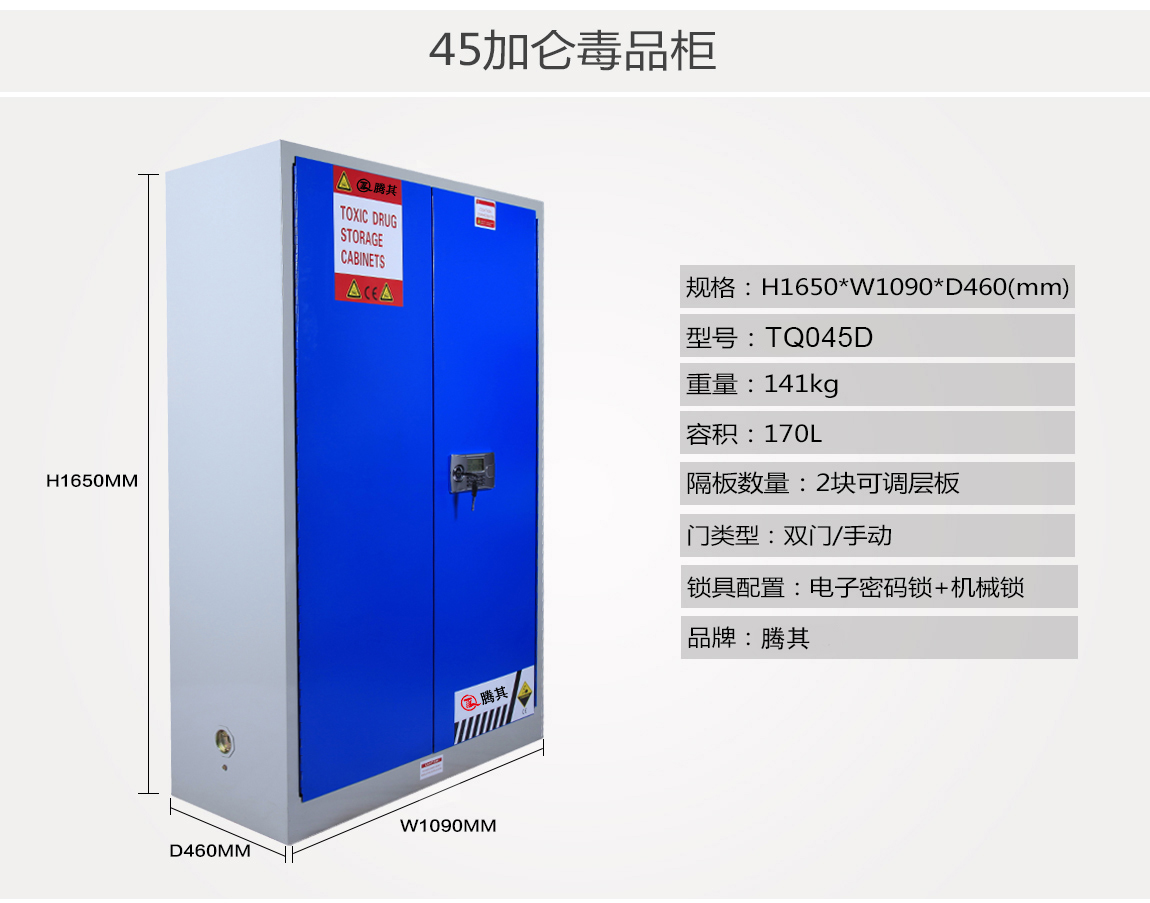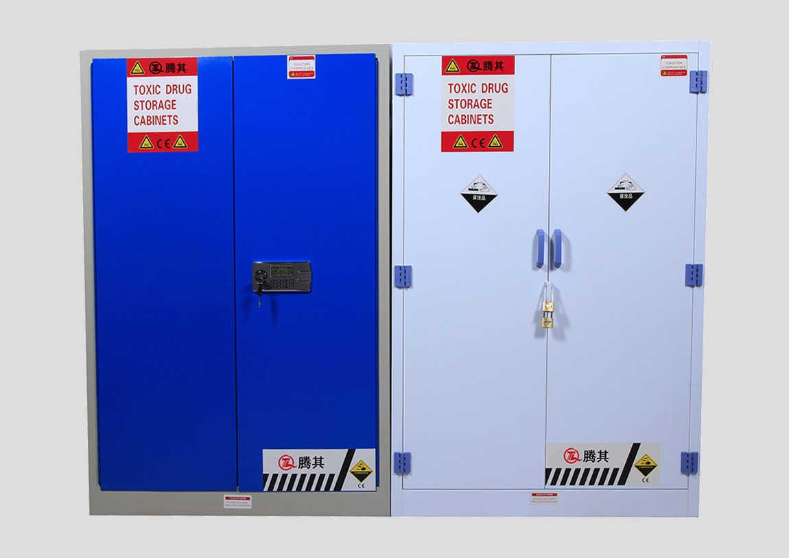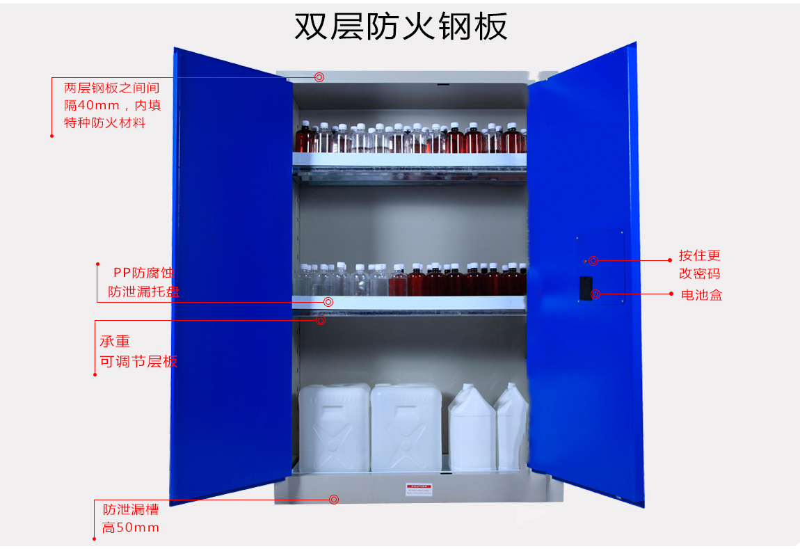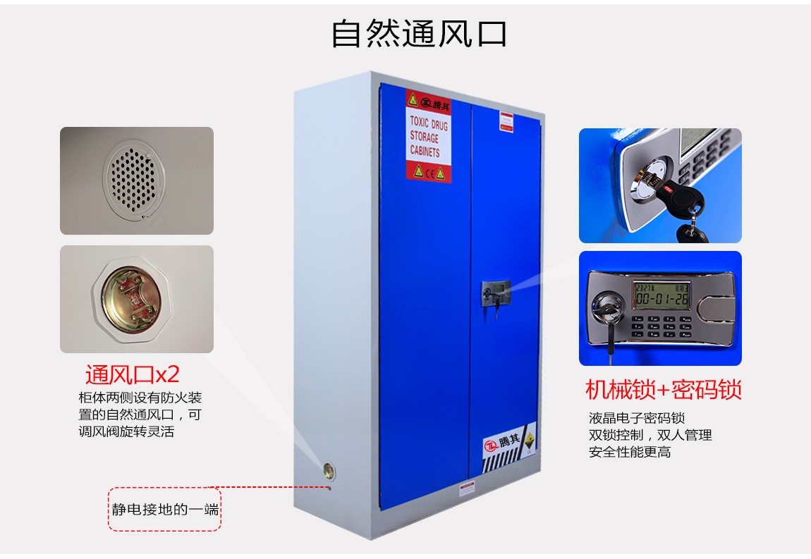 1:TQ腾其 剧毒药品储存柜整体为双层1.2mm防火钢板构造,两层钢板之间间隔40mm,绝缘层内填特种防火材料,防火性能更为卓越。柜体采用全焊接,非铆结构使其拥有更长的使用时间,因为减少了空气间隙可在着火时提供更好的防护。