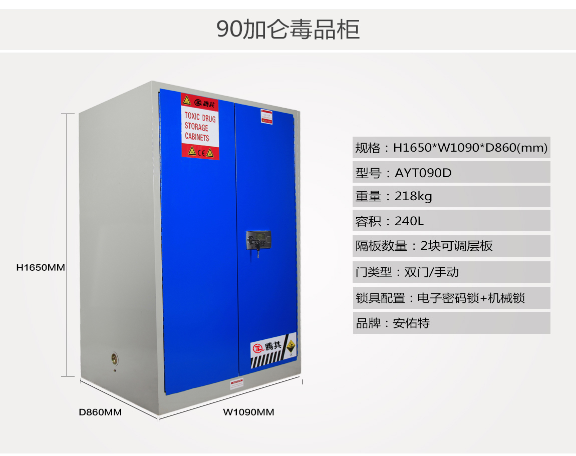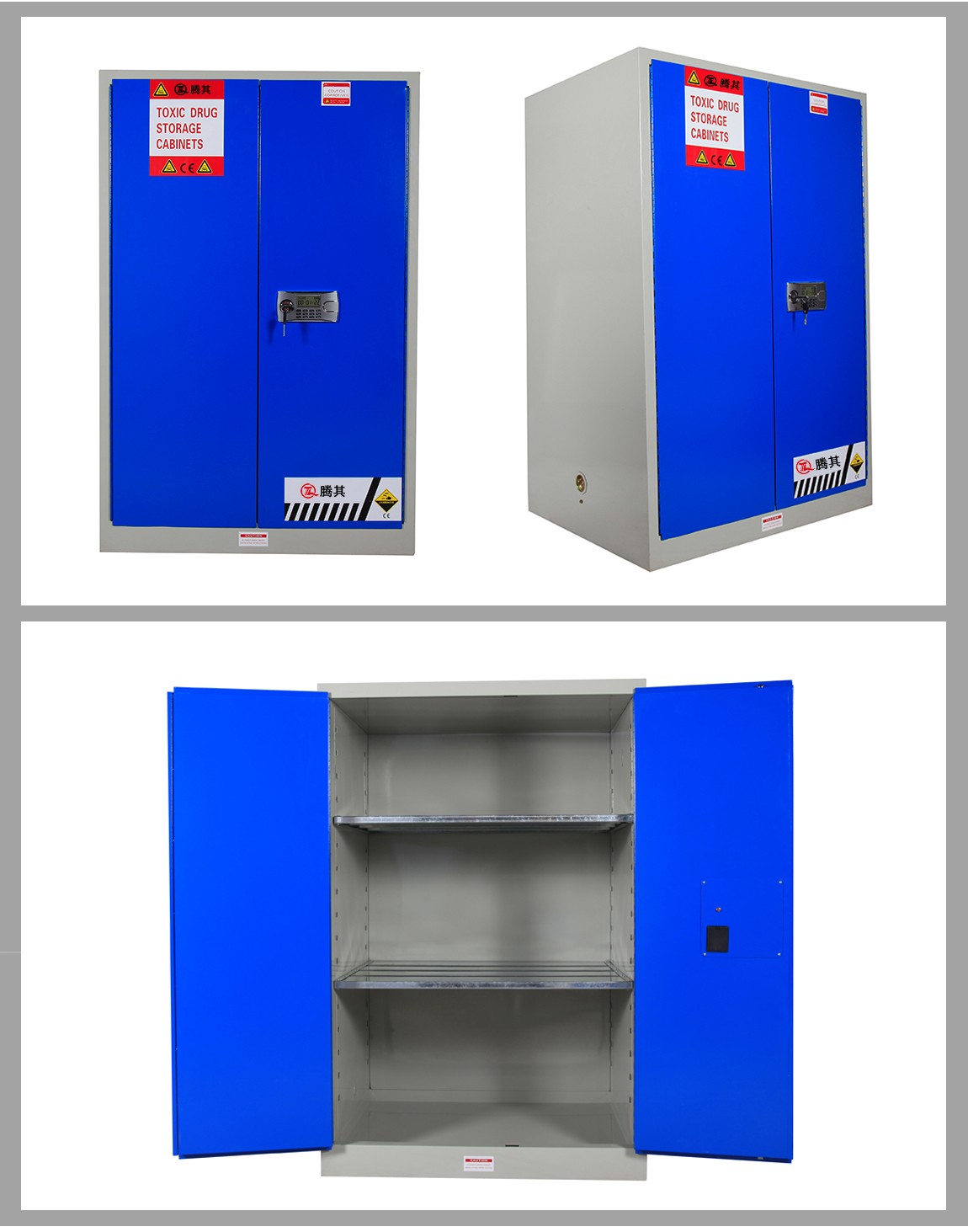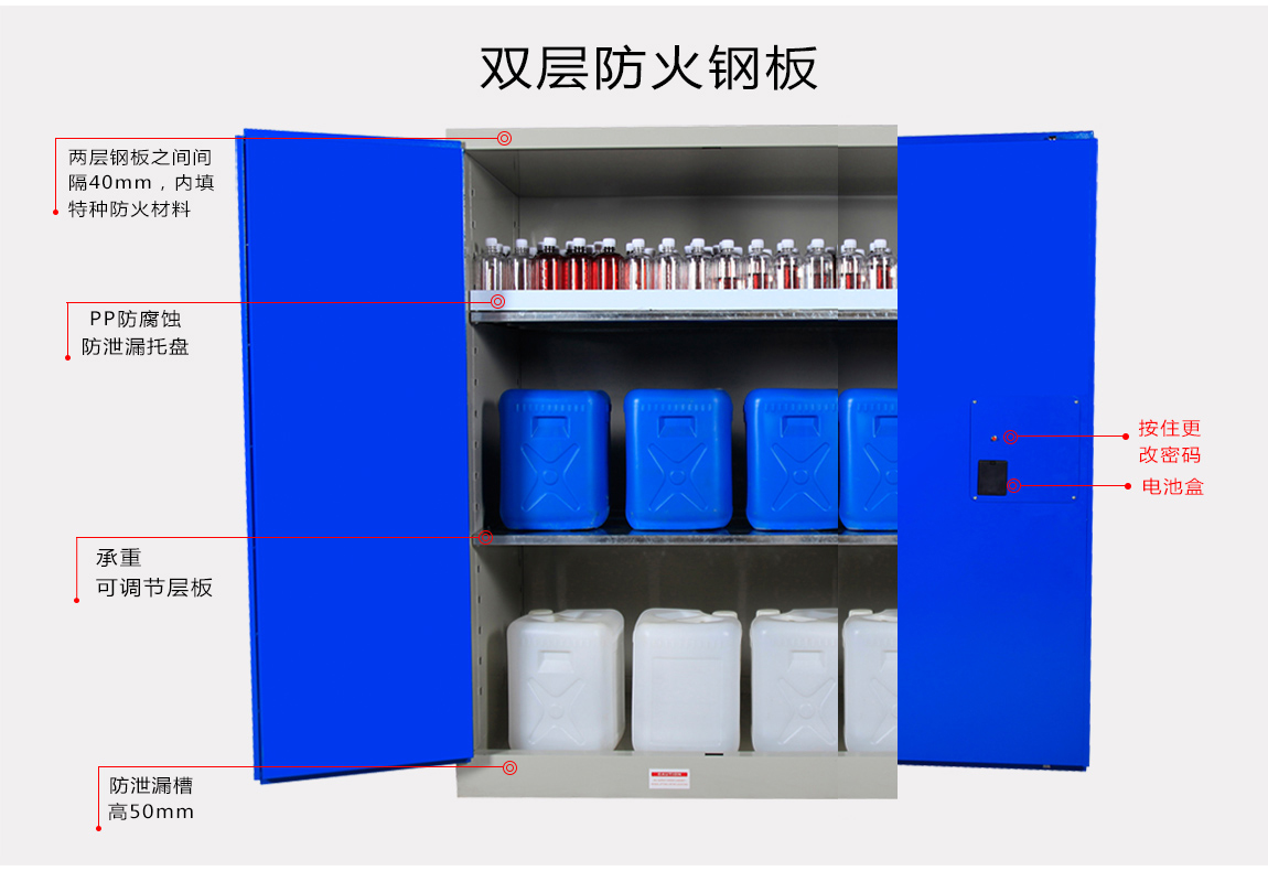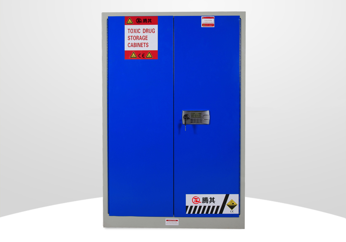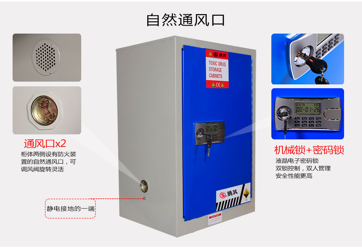 1:TQ腾其 剧毒药品储存柜整体为双层1.2mm防火钢板构造,两层钢板之间间隔40mm,绝缘层内填特种防火材料,防火性能更为卓越。柜体采用全焊接,非铆结构使其拥有更长的使用时间,因为减少了空气间隙可在着火时提供更好的防护。