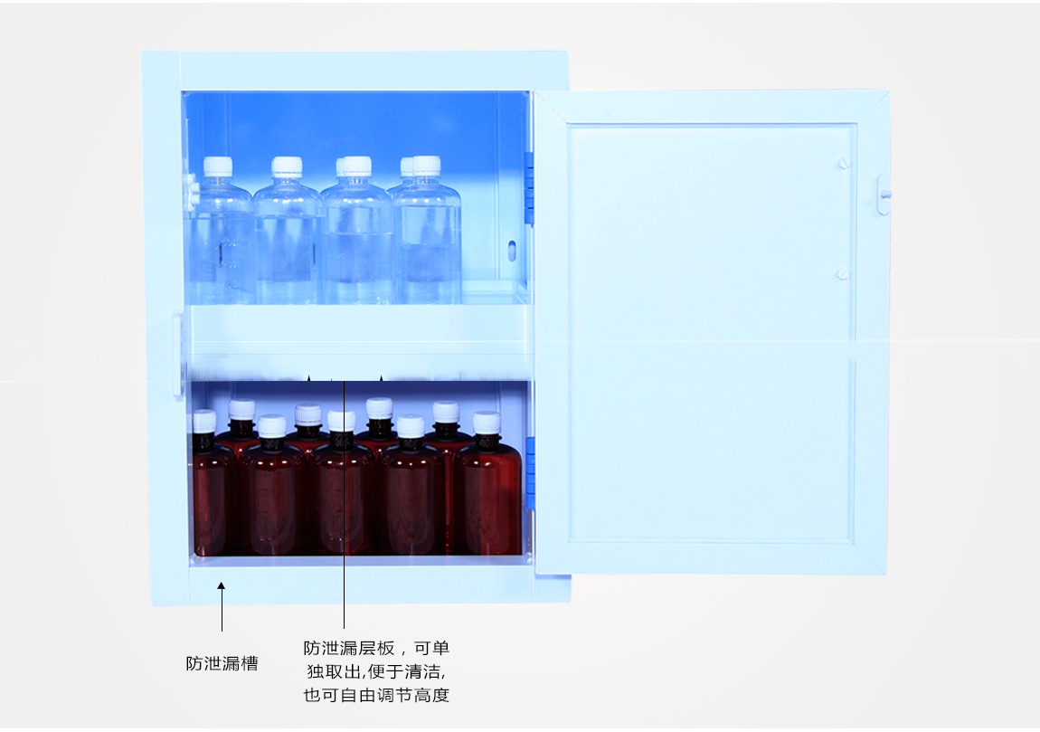 3.配备聚丙烯防泄漏托盘,可单独取出,便于清洁,层板可根据需要调节。