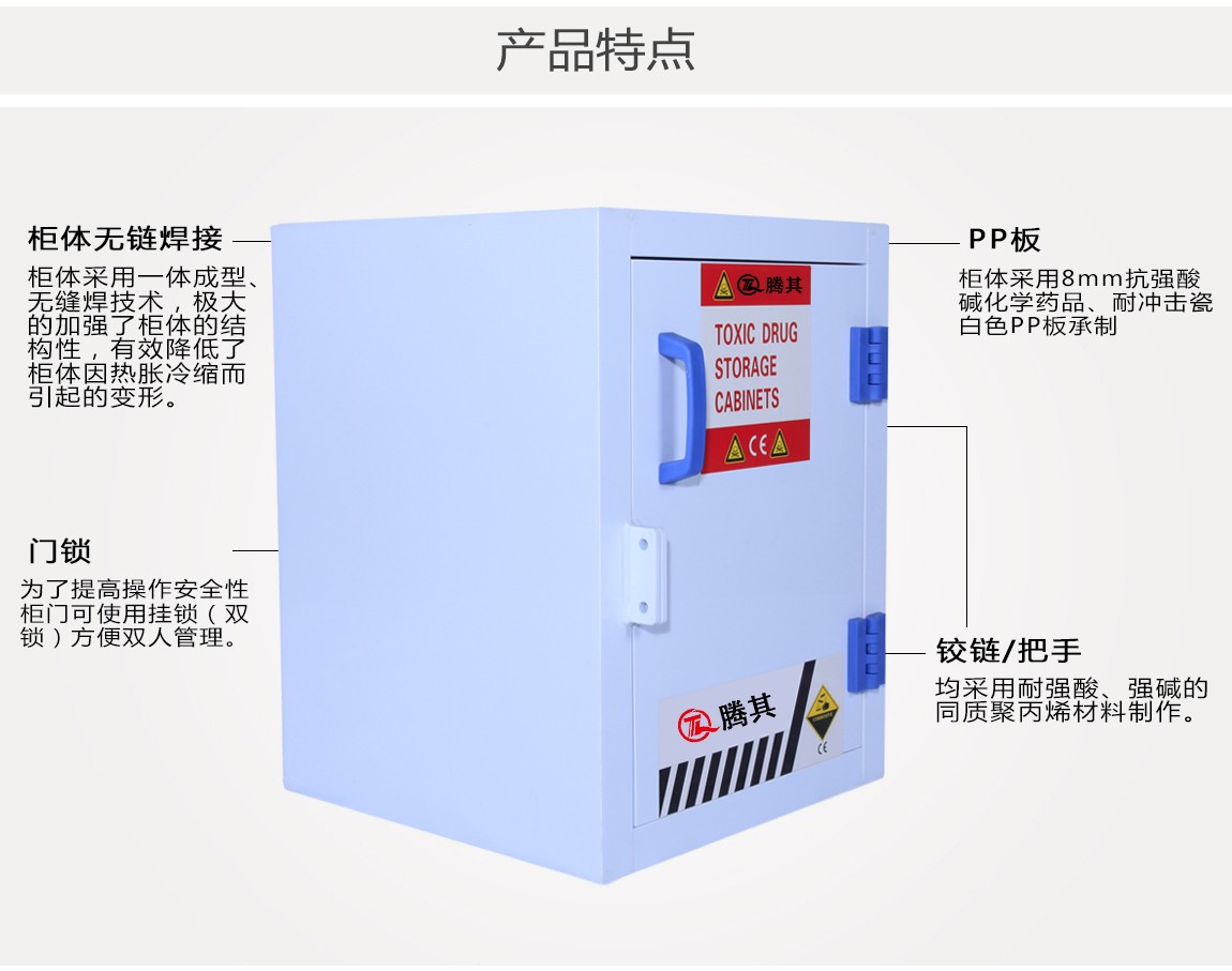 瓷白色PP聚丙烯抗强腐蚀性化学品安全储存柜的特点: