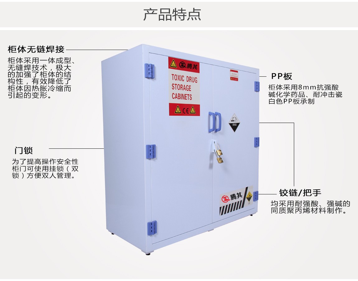 瓷白色PP聚丙烯抗强腐蚀性化学品安全储存柜的特点: