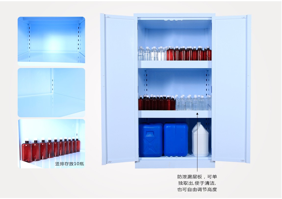 3.配备聚丙烯防泄漏托盘,可单独取出,便于清洁,层板可根据需要调节。