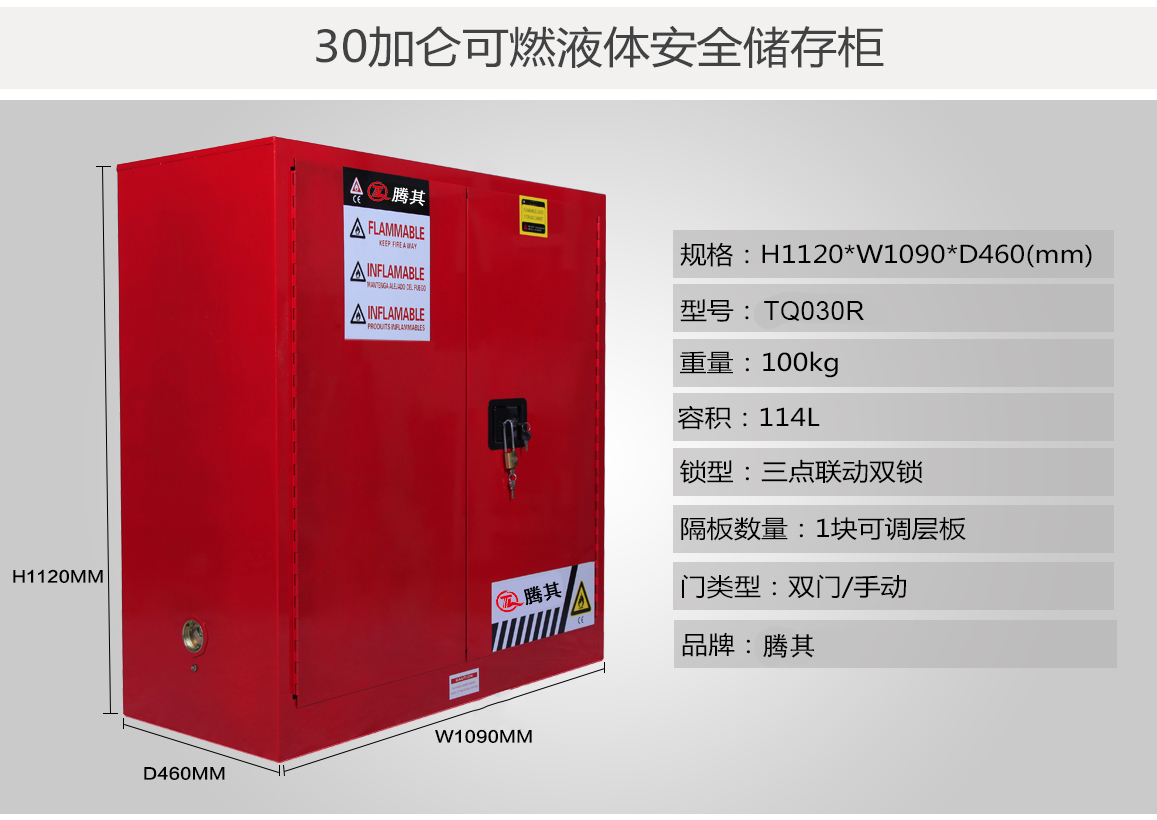 高性能的TQ腾其安全柜达到OSHA 29 CFR1910.106标准(美国职业安全健康管理局),符合NFPA CODE30(美国国家消防协会)第30条规定的要求用于规范存储易燃易爆液体及危险化学品。