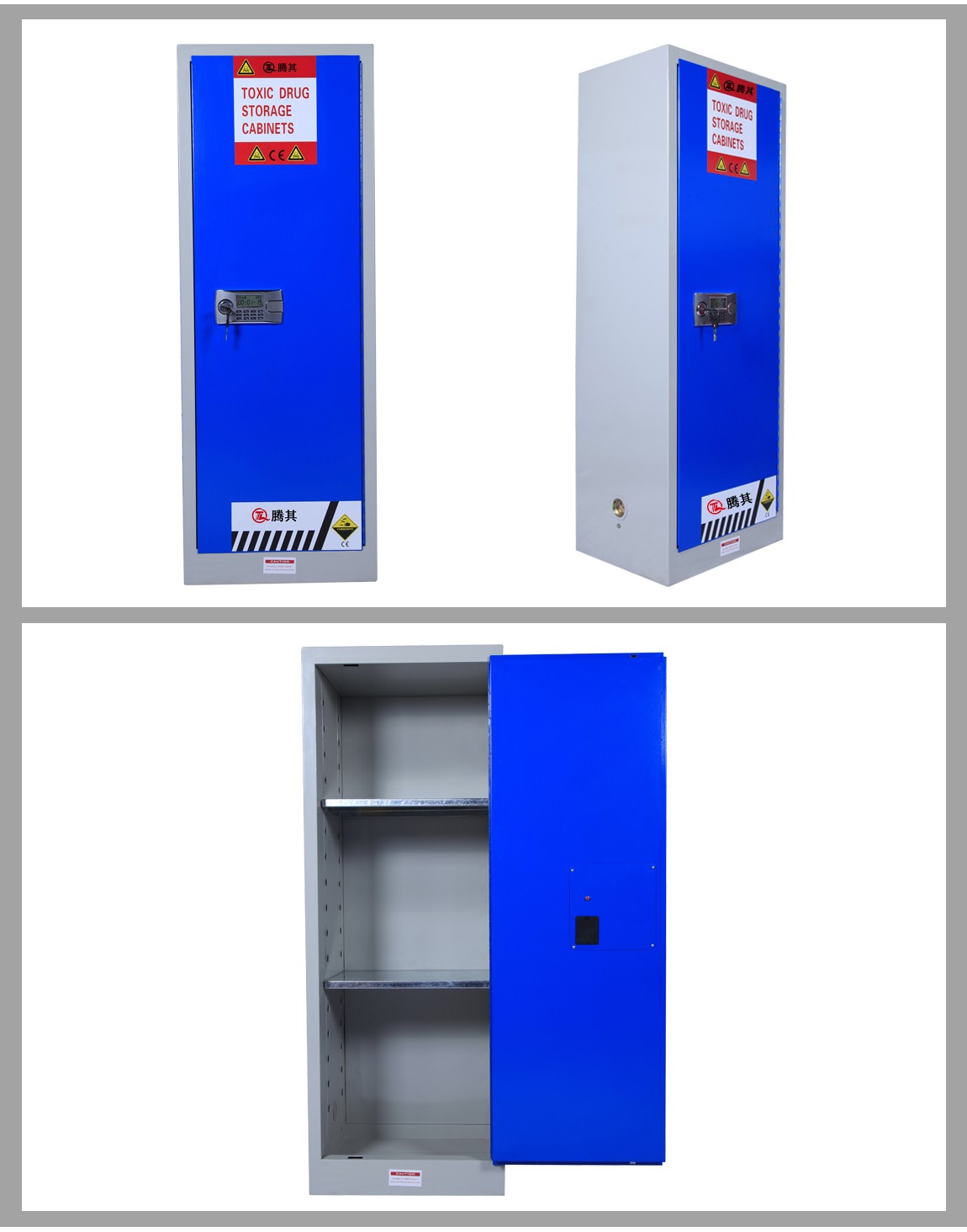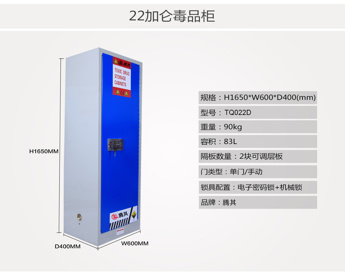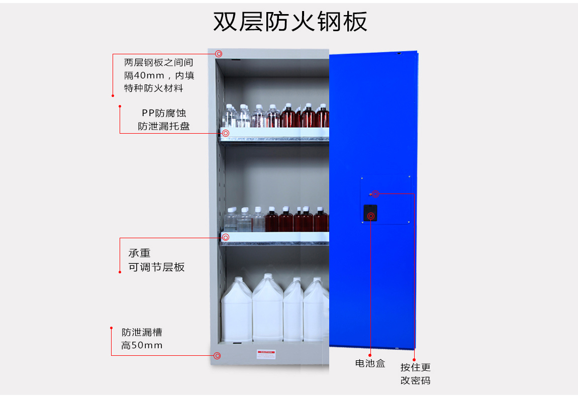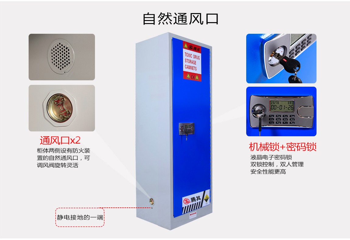 1:TQ腾其 剧毒药品储存柜整体为双层1.2mm防火钢板构造,两层钢板之间间隔40mm,绝缘层内填特种防火材料,防火性能更为卓越。柜体采用全焊接,非铆结构使其拥有更长的使用时间,因为减少了空气间隙可在着火时提供更好的防护。