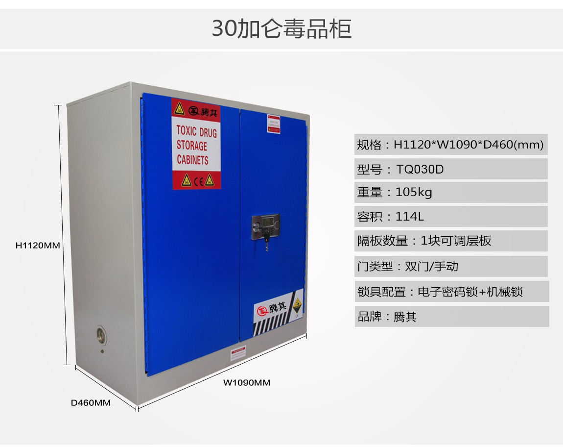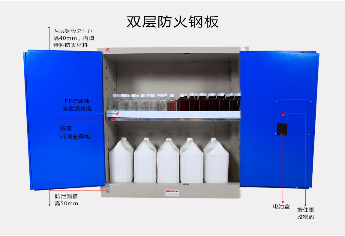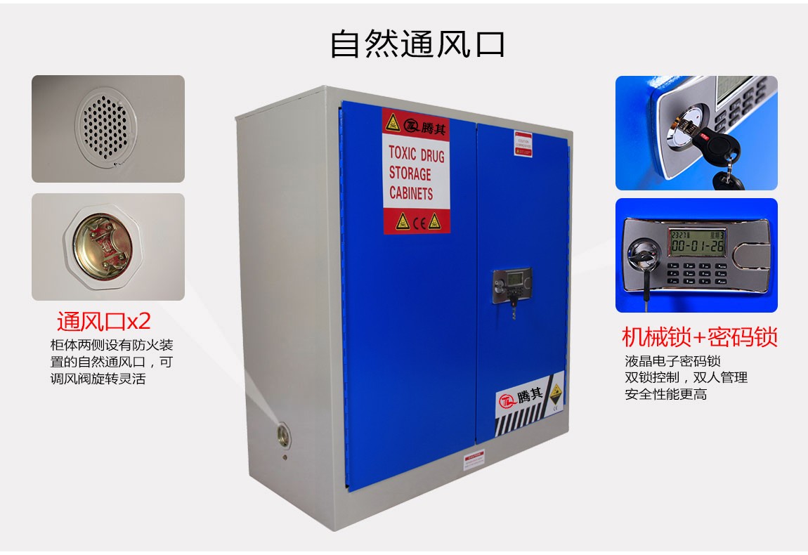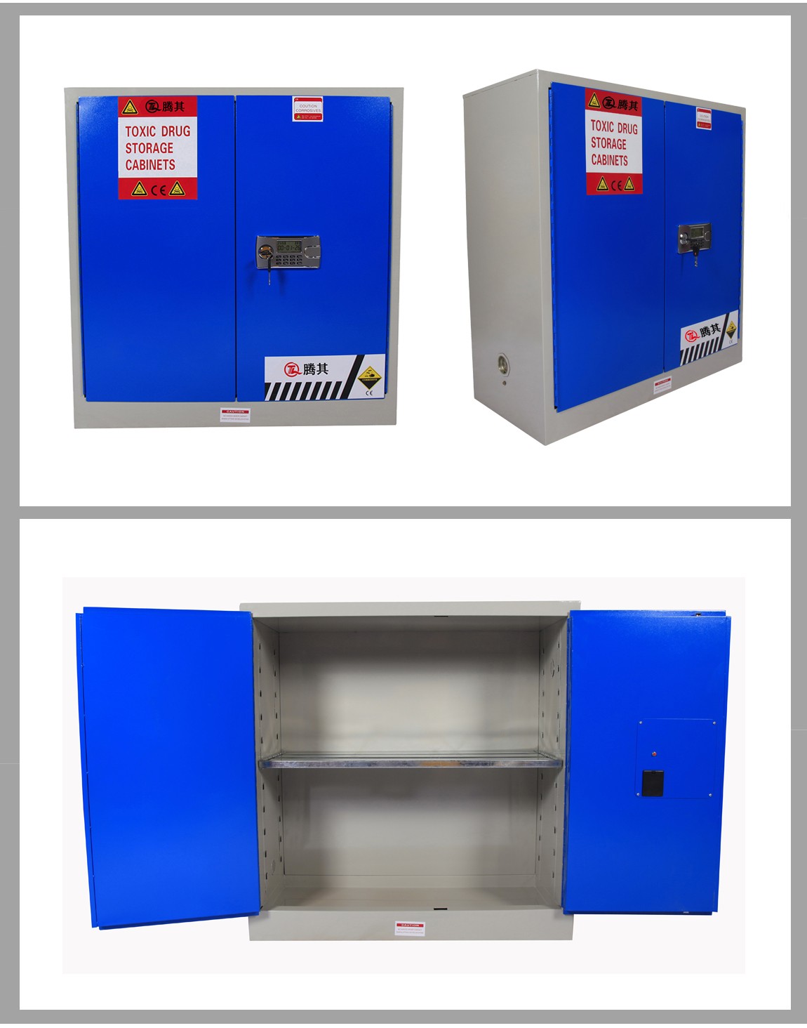 1:TQ腾其 剧毒药品储存柜整体为双层1.2mm防火钢板构造,两层钢板之间间隔40mm,绝缘层内填特种防火材料,防火性能更为卓越。柜体采用全焊接,非铆结构使其拥有更长的使用时间,因为减少了空气间隙可在着火时提供更好的防护。