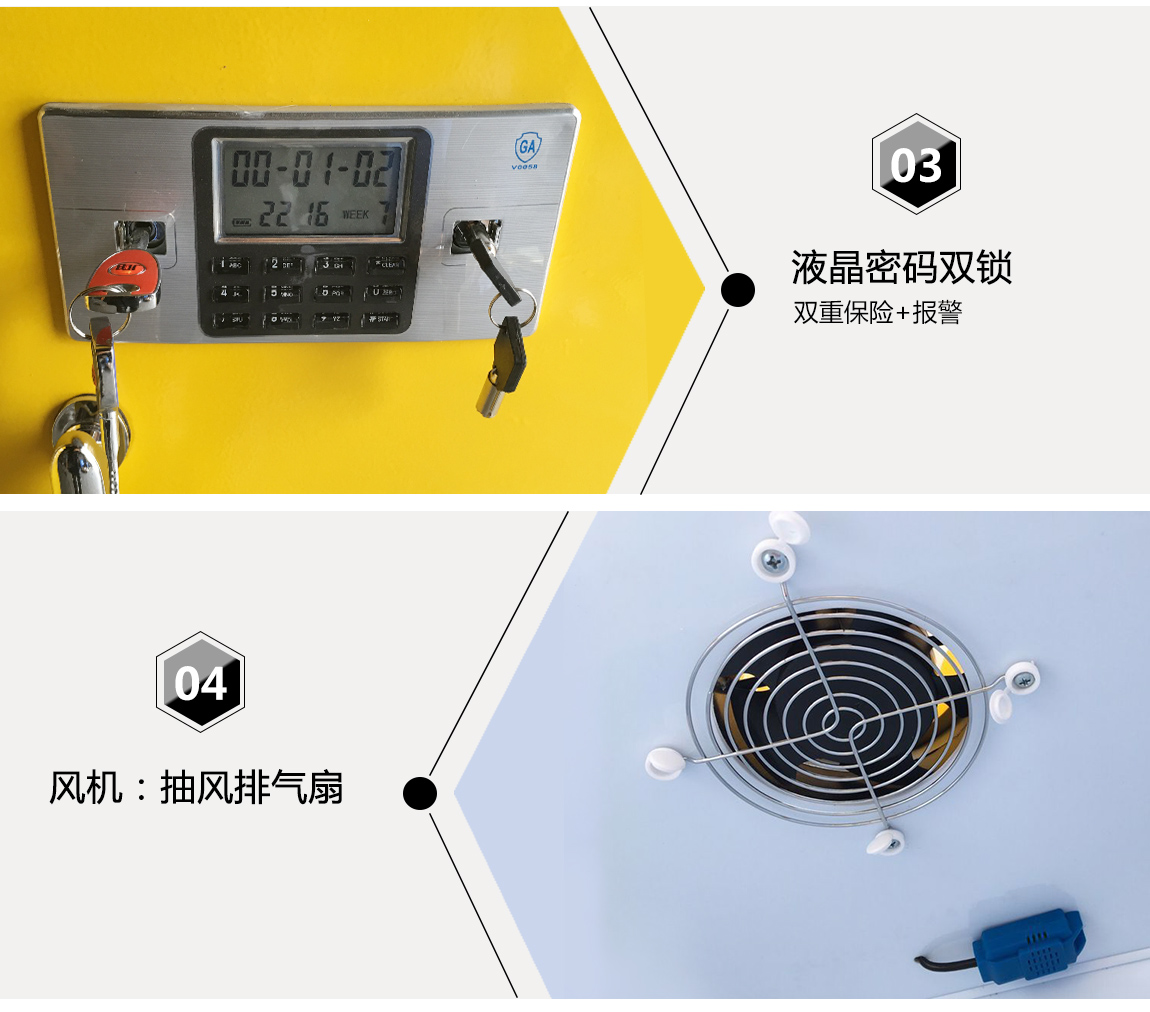 6.温湿度控制报警装置:柜体顶上应配置温湿度控制器,对柜内相对温湿度实时监控,数字显示设定和测量值,柜内的温湿度如超过设定的测量值即时报警提示。温度启控0~99.9℃(用户设定),湿度启控0~99.9%RH(用户设定);