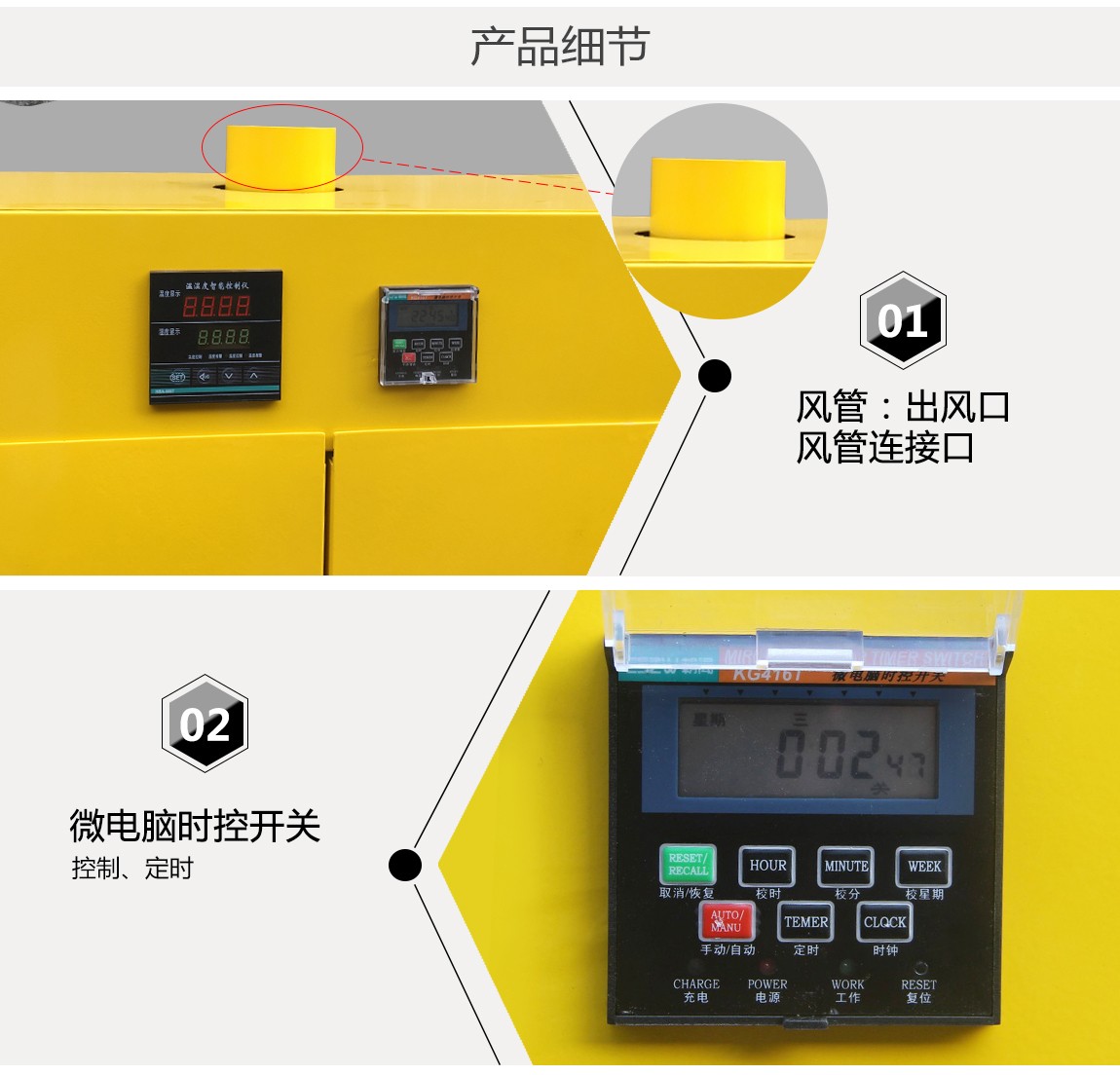 5.通风控制装置:设置进风口及可调风阀,设置通风口,通风口最大风速应不小于0.5m/s,配有微电脑定时时控开关,能根据用户设定的时间自动打开和关闭风机;