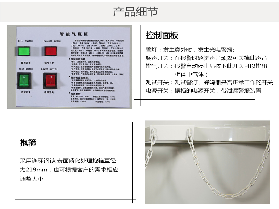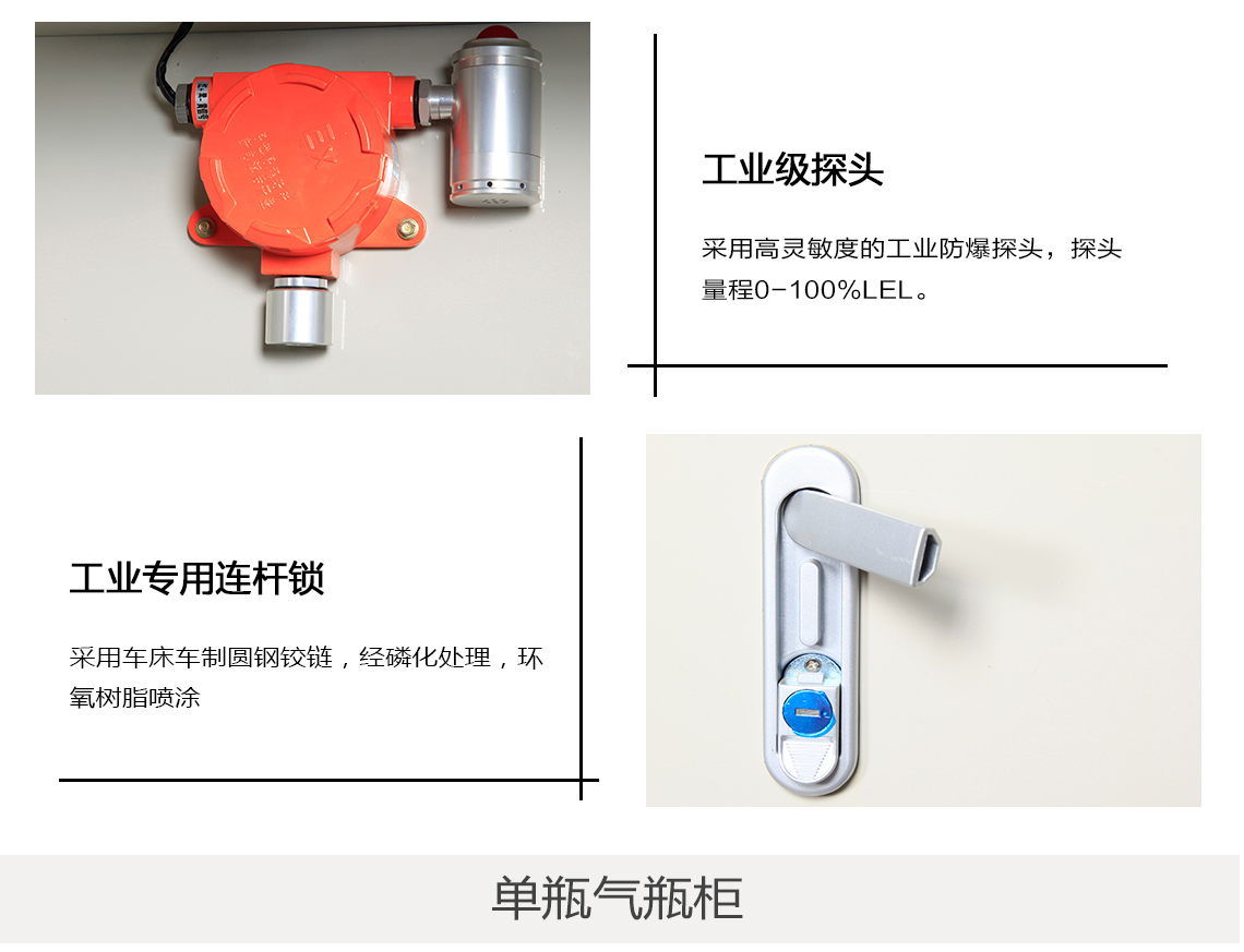 【配 置】工业专用连杆锁*1把,采用车床车制圆钢铰链,经磷化处理,环氧树脂喷涂。左右两侧开线管孔,便于气瓶气管及报警器与相关设备或电源连接;