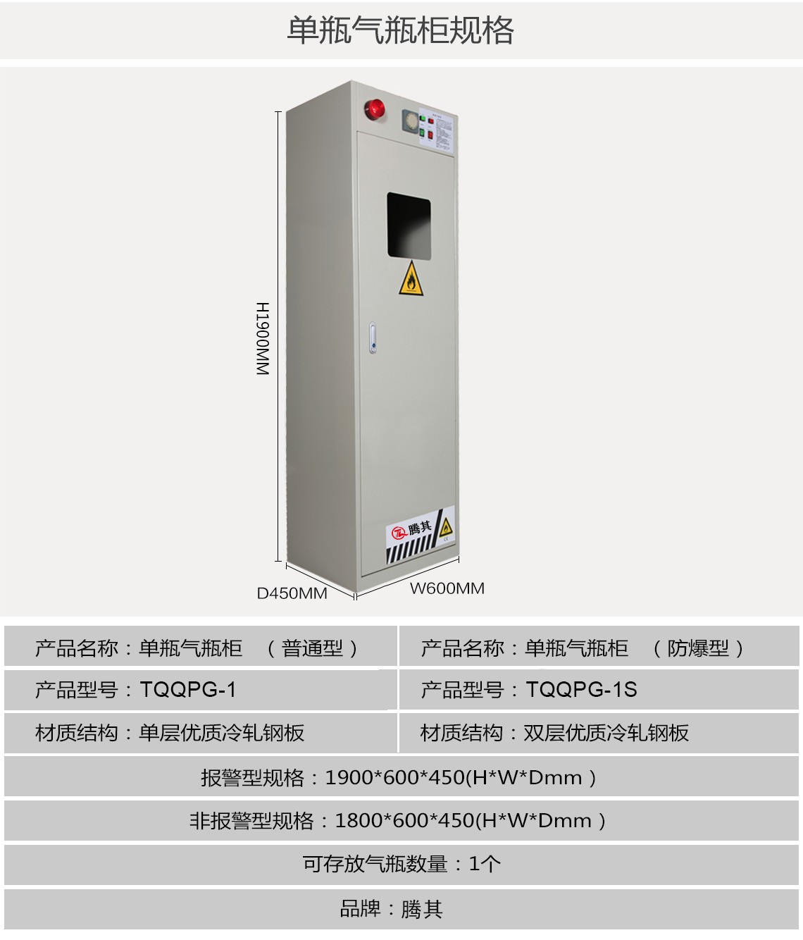 【特 点】TQ腾其 普通型气瓶柜采用单层1.2MM防火钢板构造。双层防爆型气瓶柜整体为双层1.2mm防火钢板构造,两层钢板之间间隔40mm,绝缘层内填特种防火材料,防火防爆性能更为卓越。柜体采用全焊接,非铆结构使其拥有更长的使用时间,因为减少了空气间隙可在着火时提供更好的防护,本产品具有防火防爆性能。高质量的双层防爆型气瓶柜符合OSHA 29 CFR 1910.106和NFPA CODE30标准。