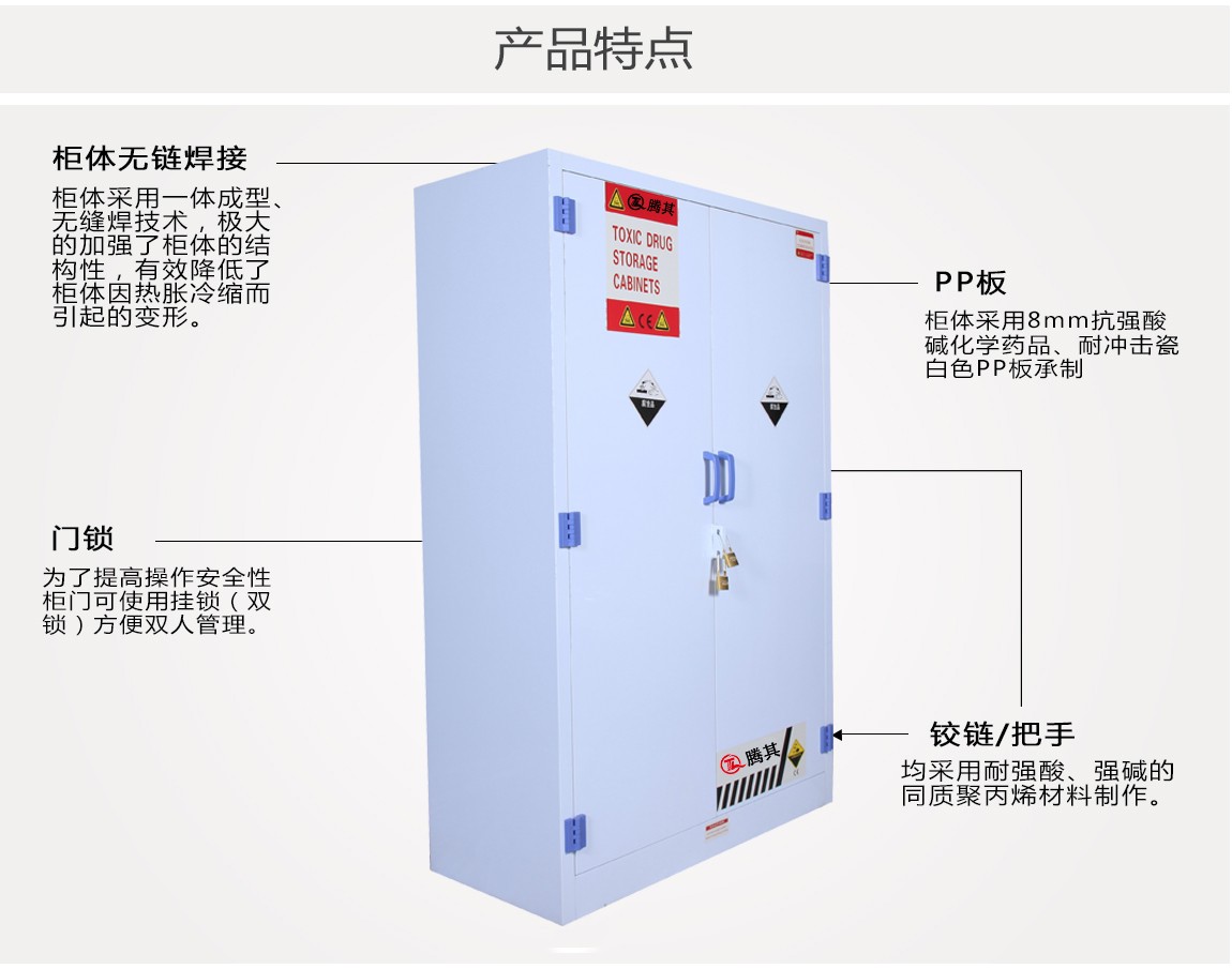 瓷白色PP聚丙烯抗强腐蚀性化学品安全储存柜的特点: