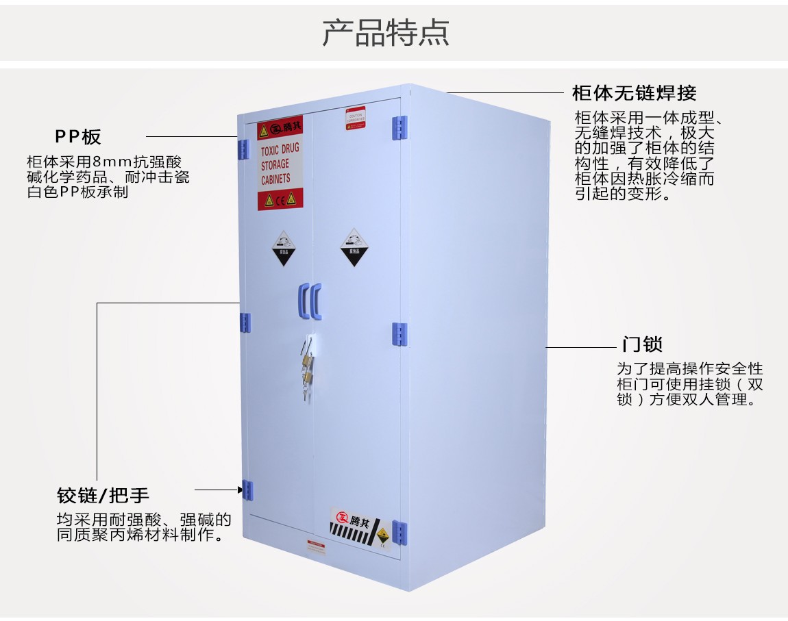瓷白色PP聚丙烯抗强腐蚀性化学品安全储存柜的特点: