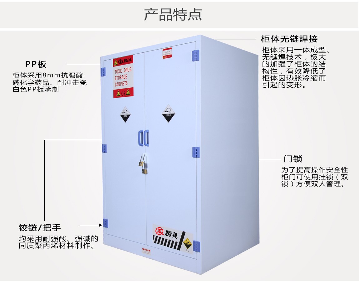 瓷白色PP聚丙烯抗强腐蚀性化学品安全储存柜的特点: