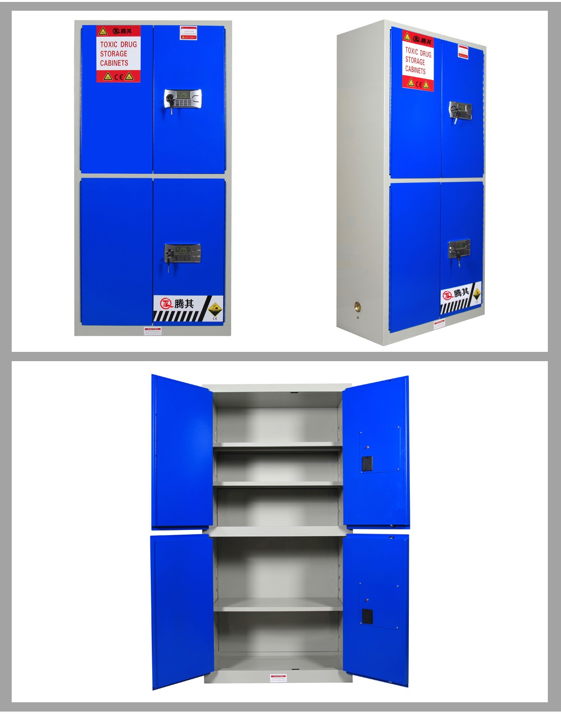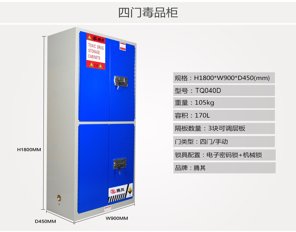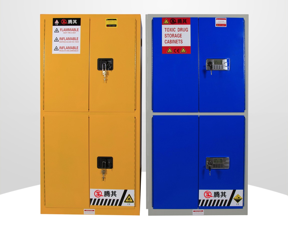 1:TQ腾其 剧毒药品储存柜整体为双层1.2mm防火钢板构造,两层钢板之间间隔40mm,绝缘层内填特种防火材料,防火性能更为卓越。柜体采用全焊接,非铆结构使其拥有更长的使用时间,因为减少了空气间隙可在着火时提供更好的防护。